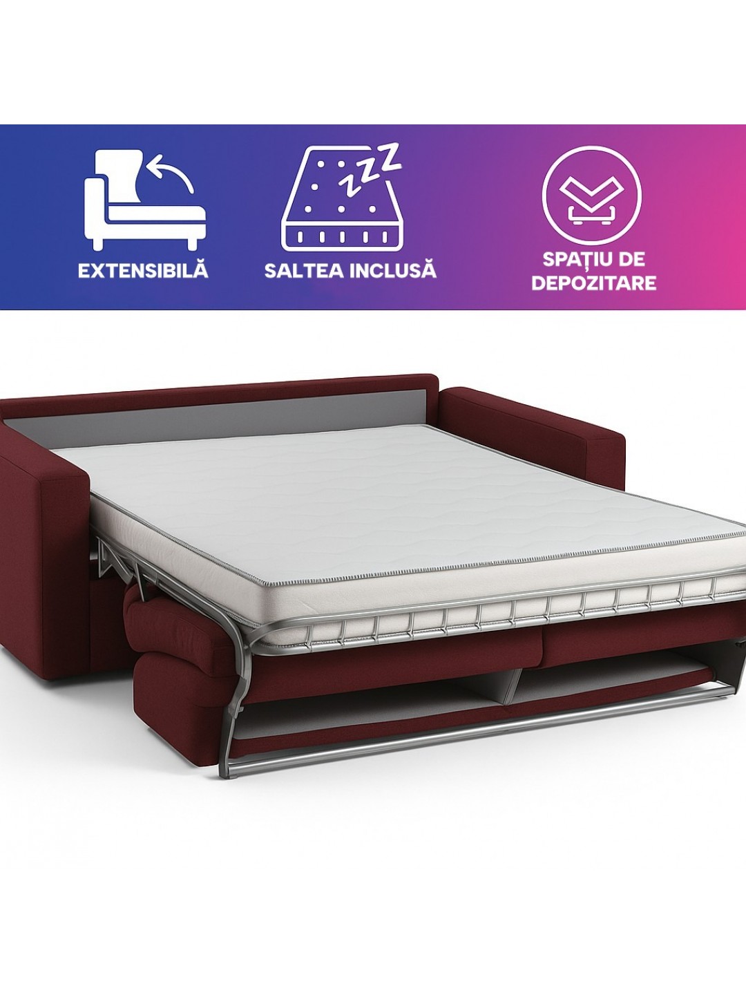 Modena este o canapea extensibilă, ideală pentru utilizare zilnică. Se transformă ușor într-un pat confortabil, include o saltea de calitate și un spațiu de depozitare ascuns pentru perne sau lenjerie. Este disponibilă în 3 dimensiuni, perfect adaptabile spațiului tău.